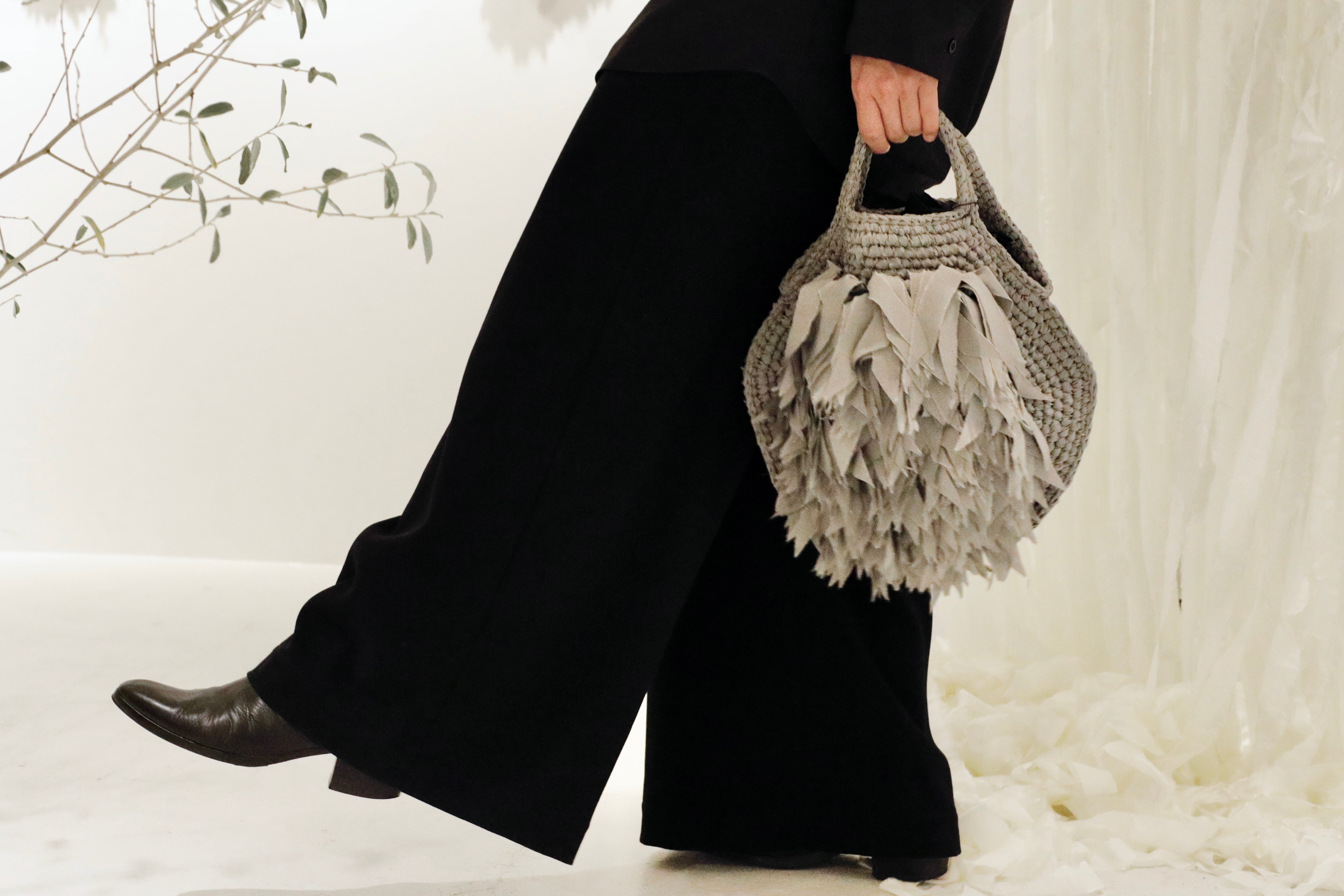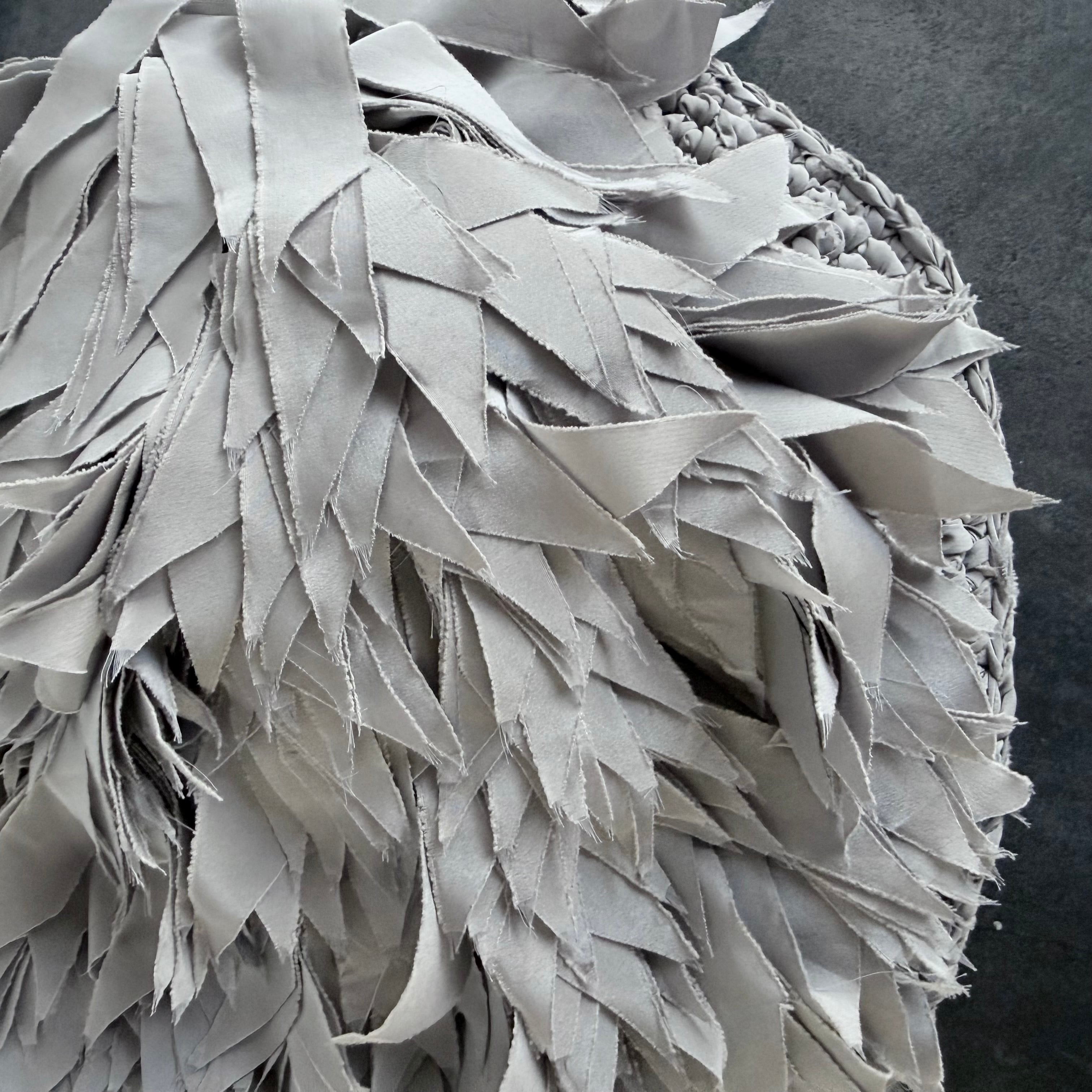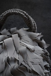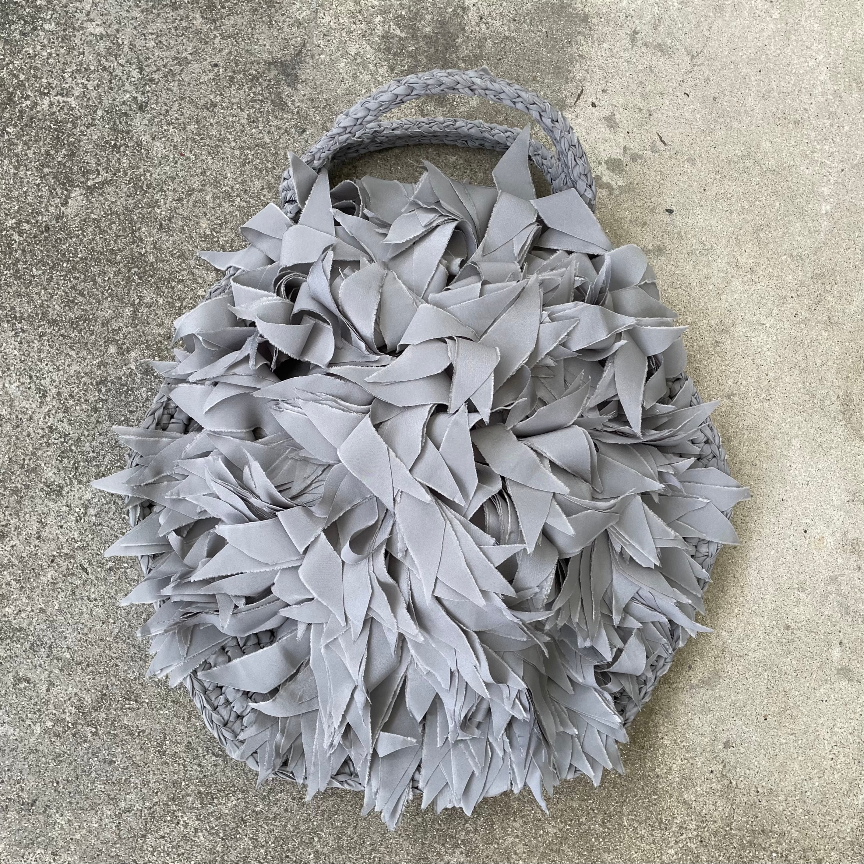 フリンジを何層にも重ね、立体の“羽”のような表情をつくったラウンドバッグ。