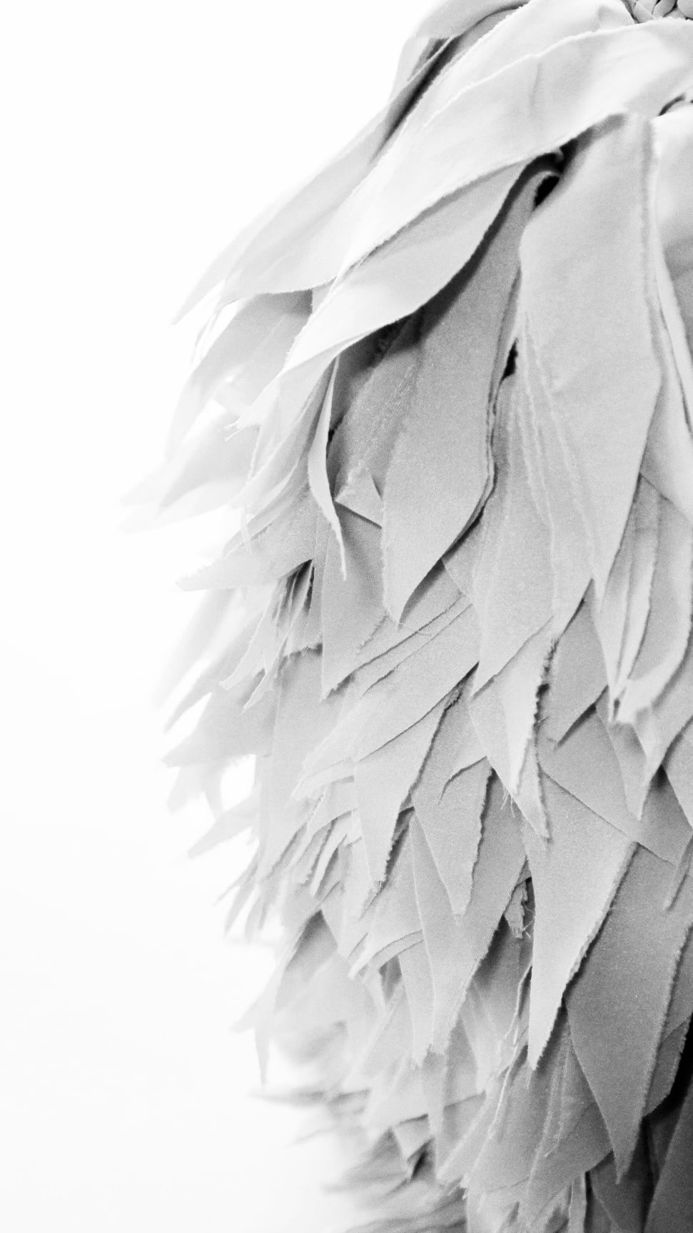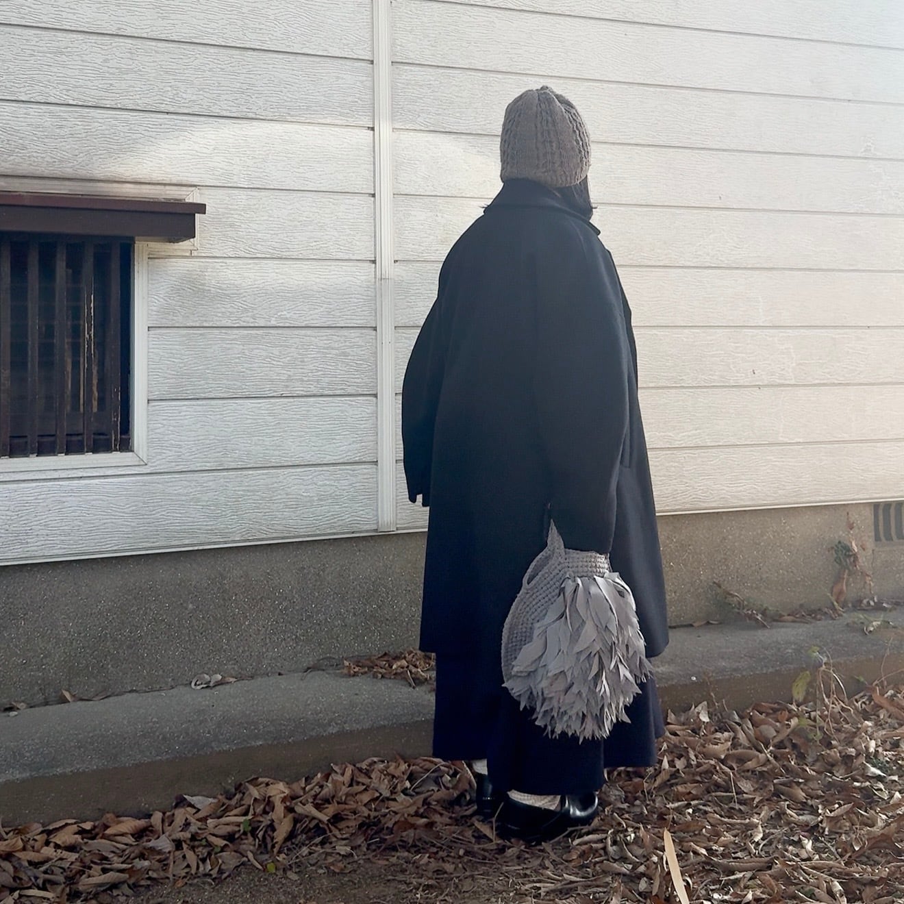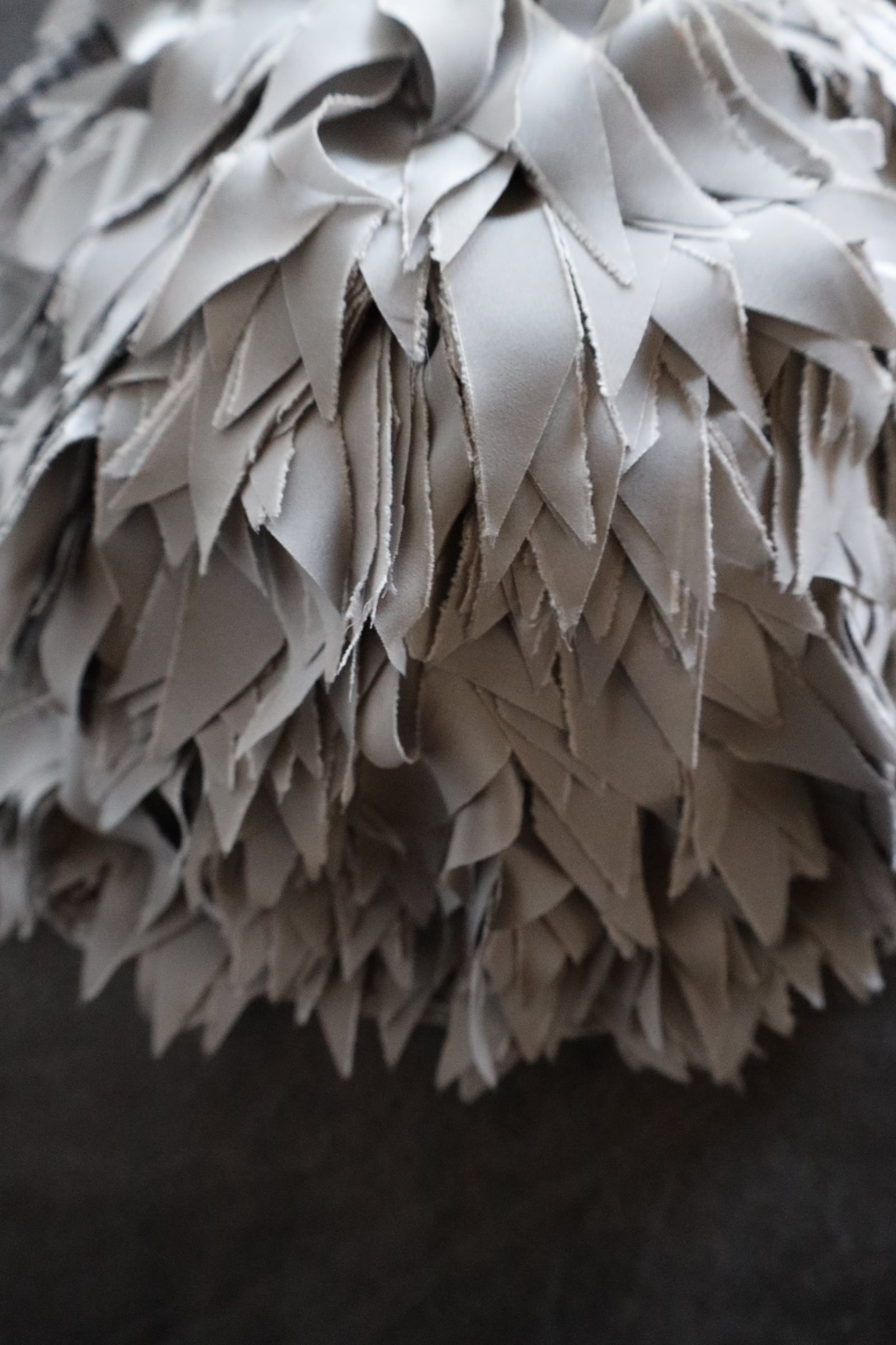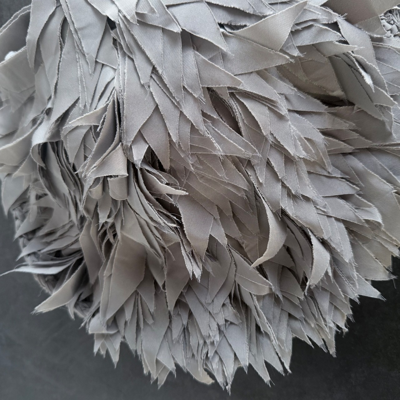 フリンジを何層にも重ね、立体の“羽”のような表情をつくったラウンドバッグ。