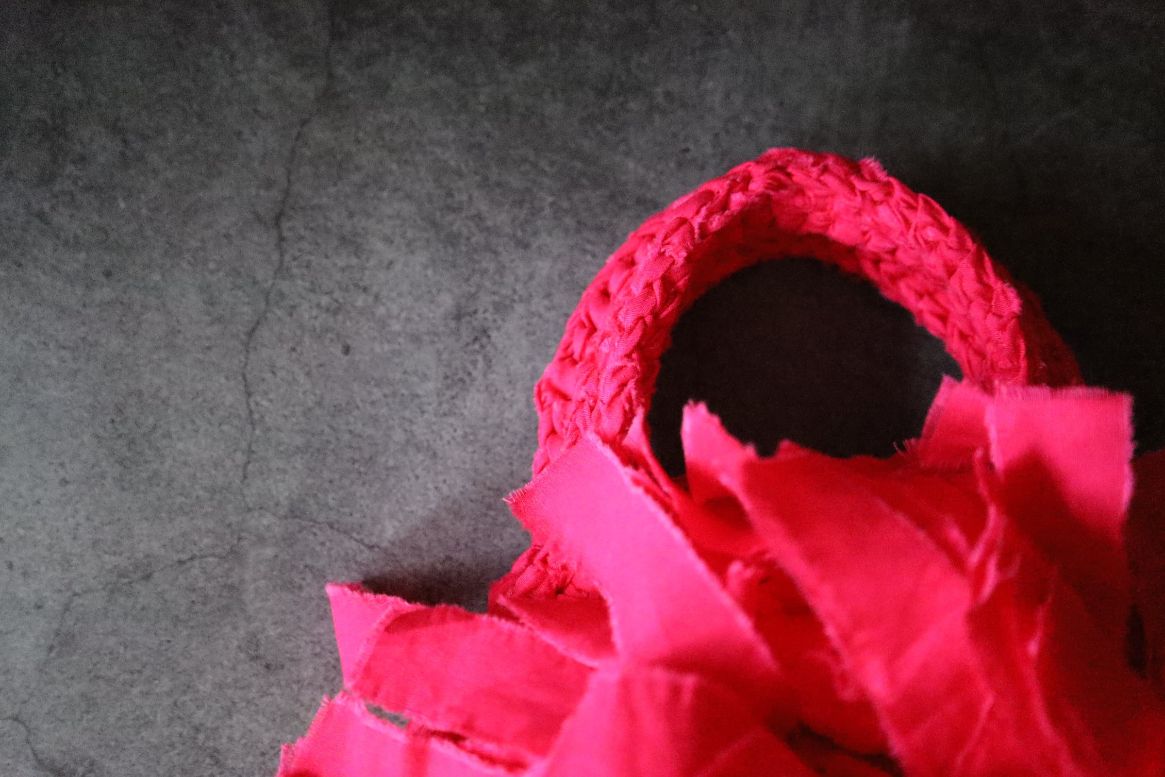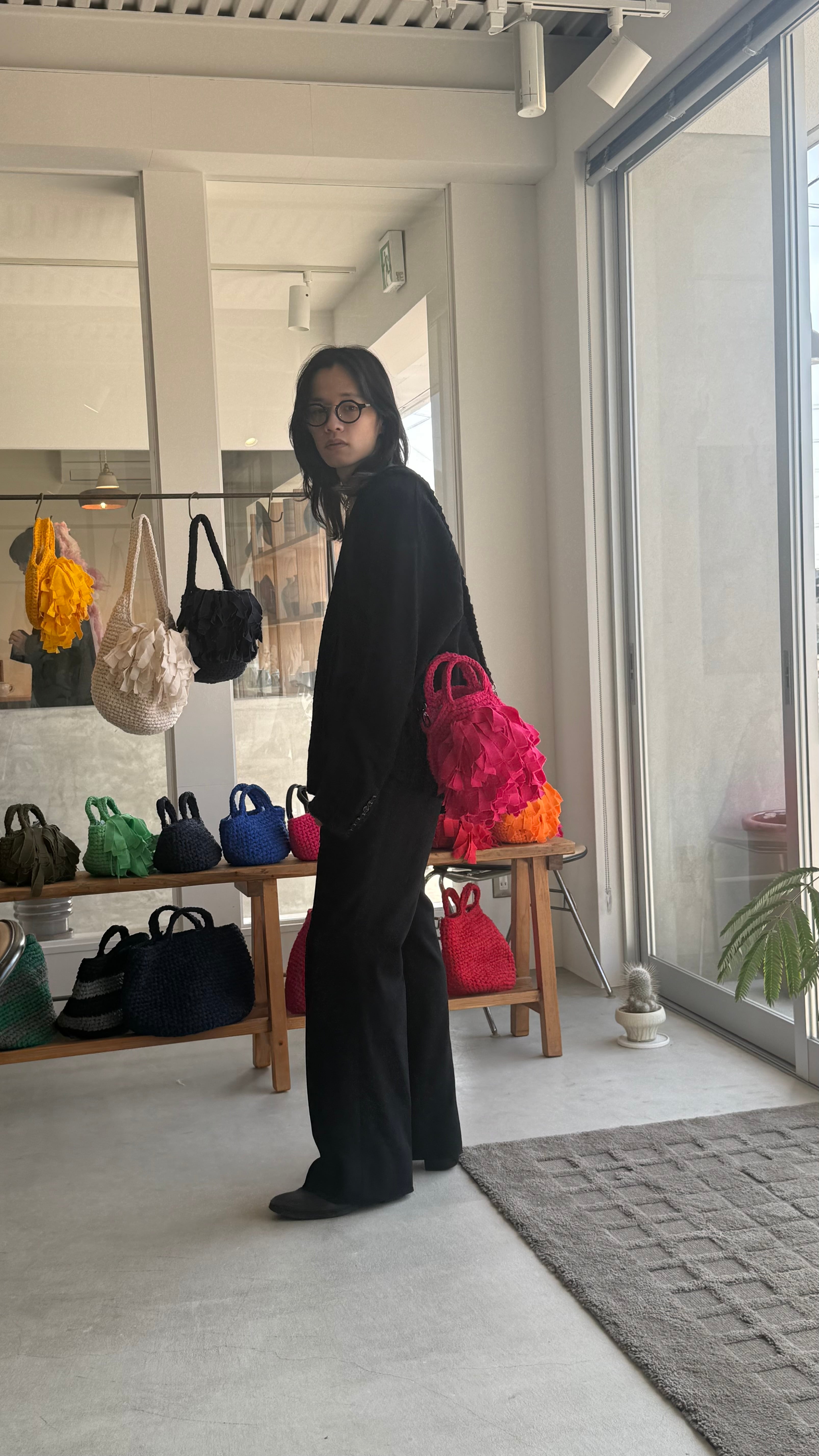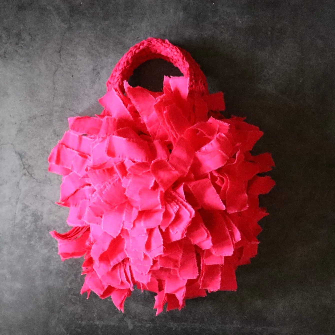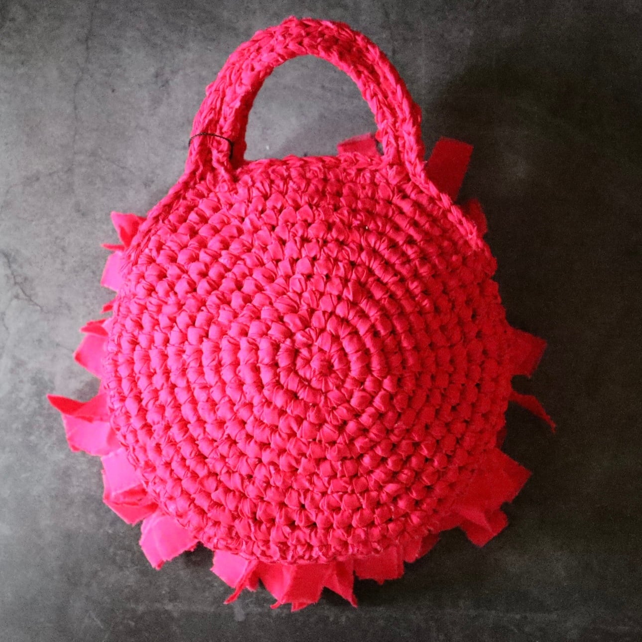 花をモチーフに、フリンジを幾重にも重ねて仕上げたラウンドフリンジバッグ。